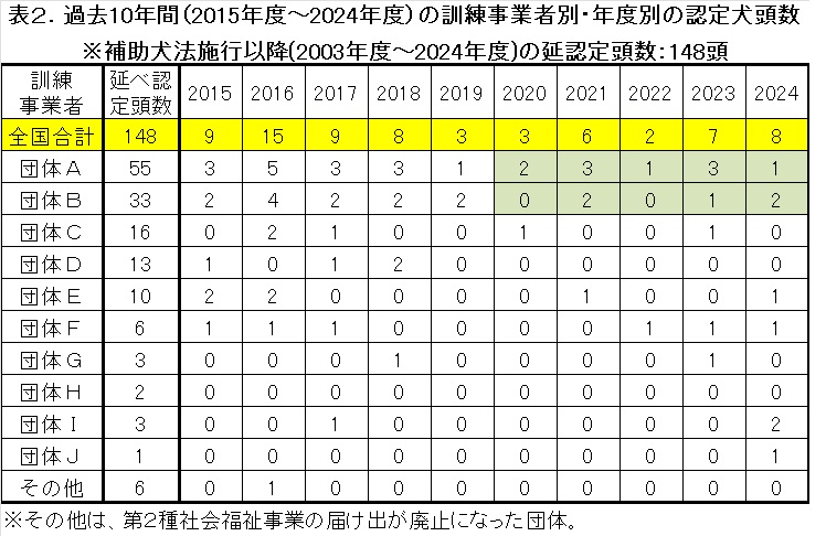 前回(2025年6月9日)のデータ更新以降に、2024年度の認定犬2頭、取消犬1頭が遅れて報告されました。そのため、「延べ認定頭数」「2024年度の認定頭数」は前回更新より2頭増え、「2024年度の取消頭数」は1頭増えています。また、2024年度の団体Eと団体Jの認定頭数がそれぞれ1頭ずつ増えています。