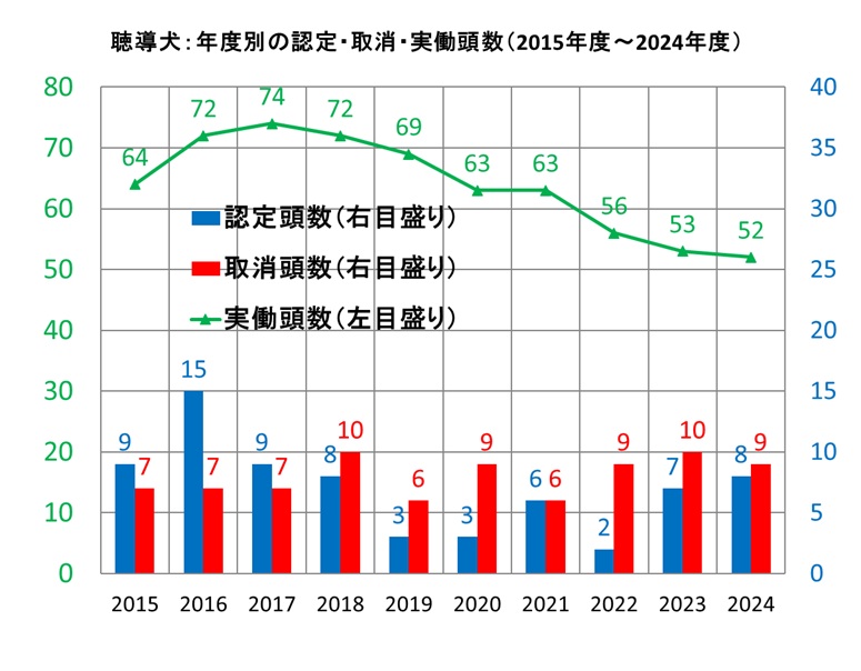 2024年度は、認定頭数が8頭、取消頭数が9頭と、実働頭数は1頭減の52頭でした。
